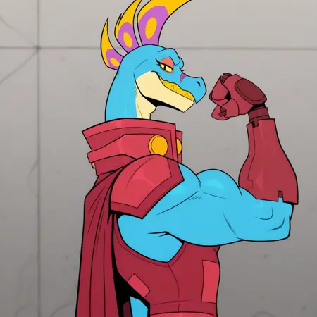 | 训练词汇 | TYN33N, flat colors, solo, eyelashes, female, anthro, alien, scalie, muscular female, long neck, two tone body, blue body, tan countershading, two tone tail, yellow sclera, purple markings, broad shoulders, flat chested, yellow head spikes, thick tail, cybernetic arm, arm spikes, spikes \(anatomy\), yellow claws, 3 fingers, fully clothed, red clothing, tight clothing, capelet, shorts, jumpsuit, sleeveless, red suit, belt buckle, high collar, rolled up pants,已复制! ankle cuffs, full-length portrait, plantigrade, barefoot, 3 toes,已复制! |