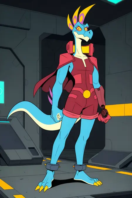 | 학습된 단어 | TYN33N, flat colors, solo, female, anthro, alien, scalie, muscular female, long neck, two tone body, blue body, tan countershading, two tone tail, yellow sclera, purple markings, broad shoulders, flat chested, yellow head spikes, thick tail, cybernetic arm, arm spikes, spikes \(anatomy\), yellow claws, 3 fingers, plantigrade, barefoot, 3 toes, fully clothed, red clothing, tight clothing, capelet, shorts, jumpsuit, sleeveless, red suit, belt buckle, high collar, rolled up pants, ankle cuffs, 복사됨! |