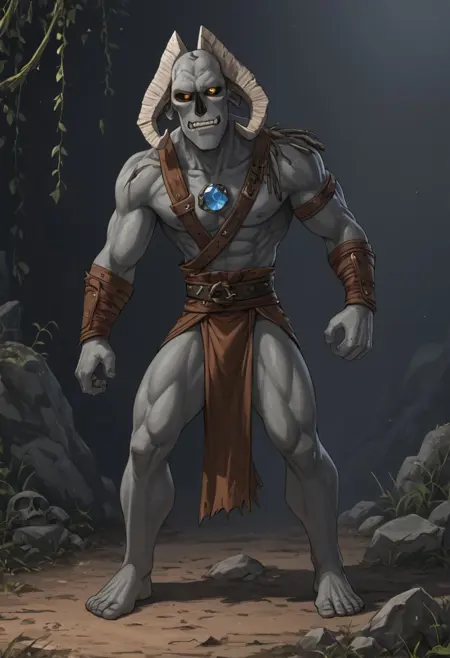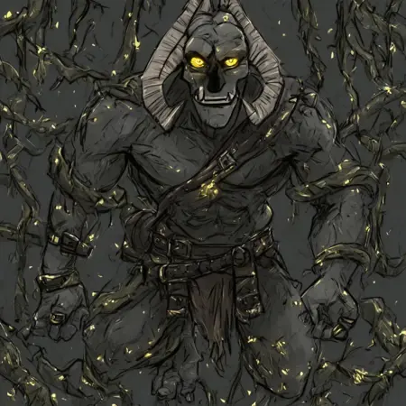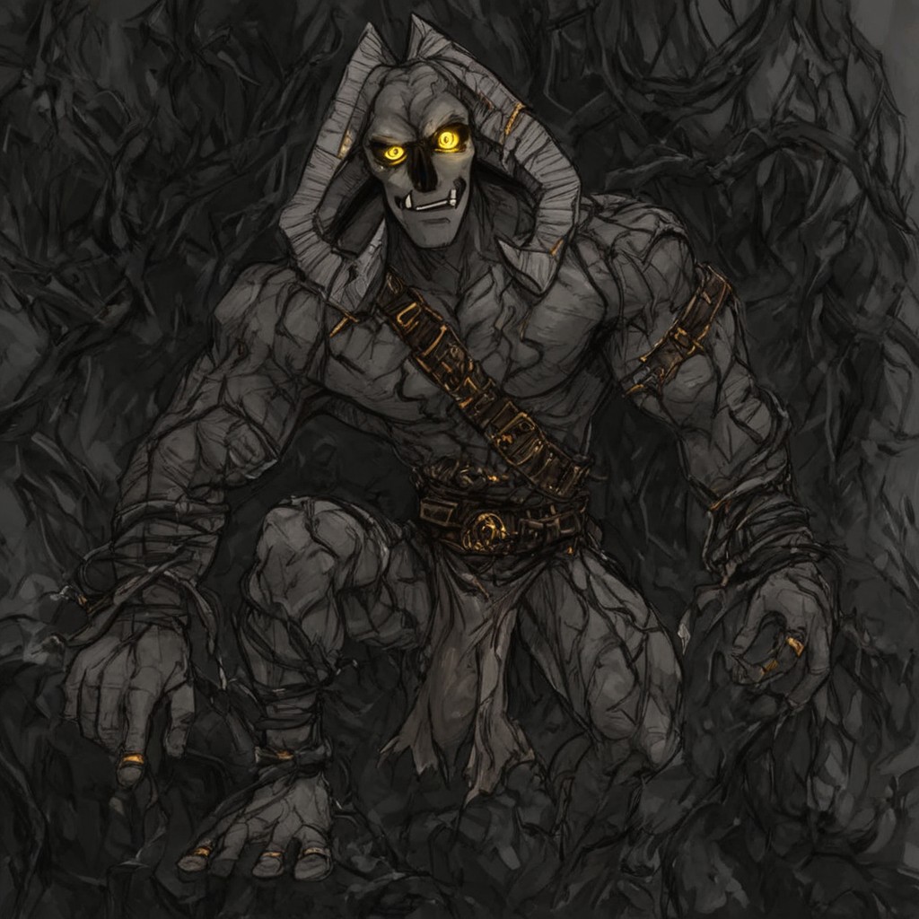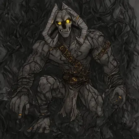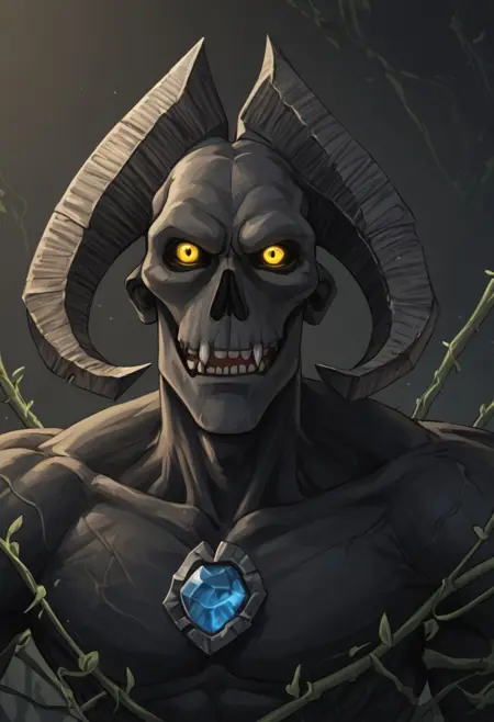 | 학습된 단어 | Human-like physique, thin head is skull-like in shape, sunken yellow eyes with black sclera, two large horns sprout from the back of its head curving around it, fangs, teeth, vines from the body and feet, black nose, underbite, blue gems inside cracks from chest복사됨! |
