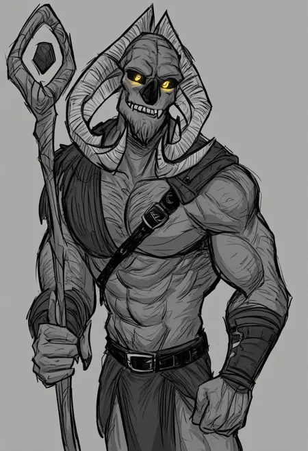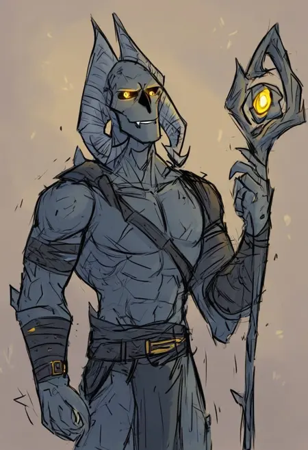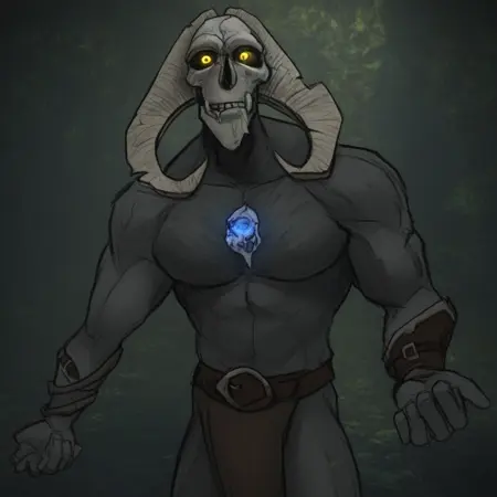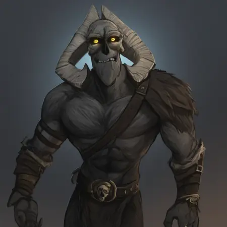 single leather strap runs from the belt and goes across his chest, stone-grey skin, multiple cracks and holes, numerous roots sprouting throughout his body