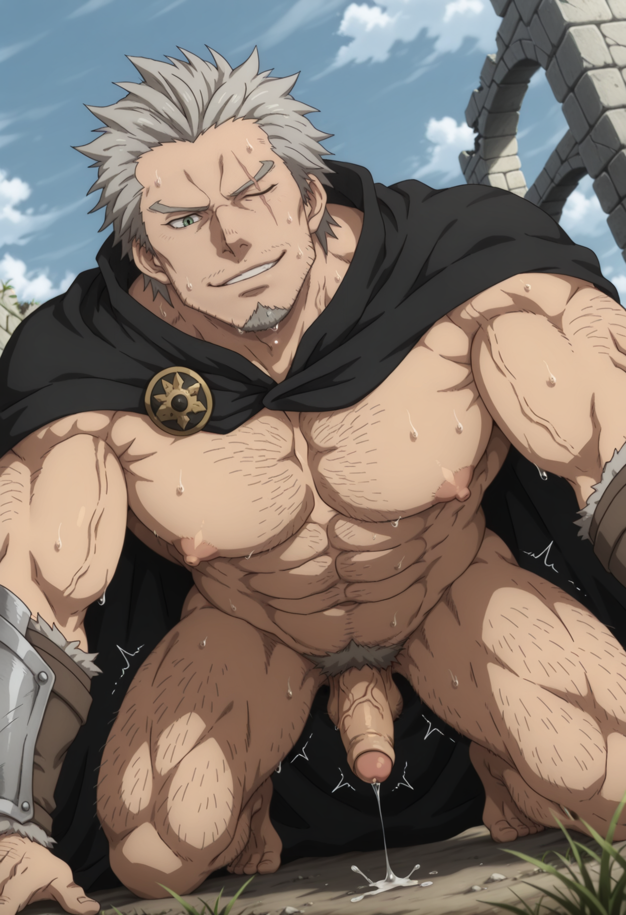 Gray hair, green eyes, Left eye scar, (left eye closed), stubble, goatee,