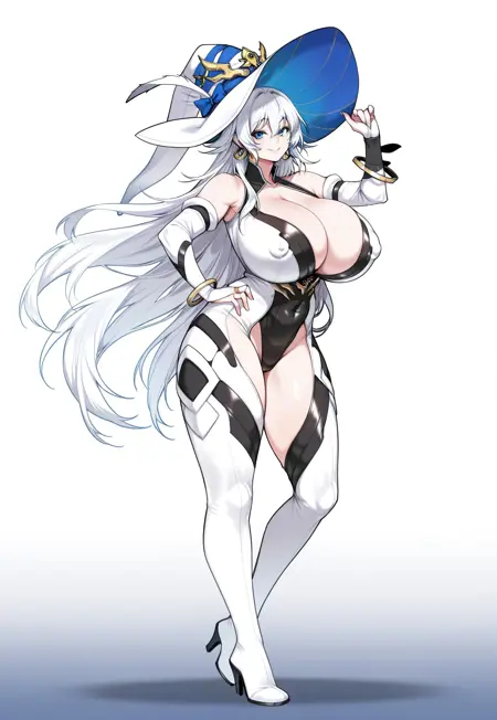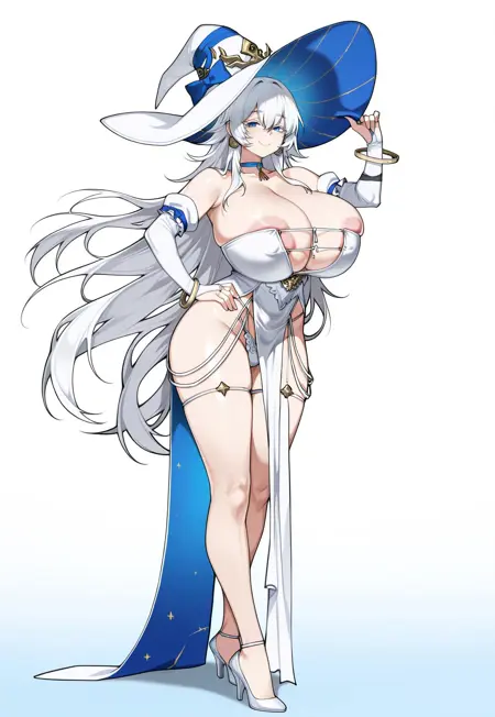 | 训练词汇 | Priana, 1girl, huge breasts size, white hair, very long hair, hair between eyes, eyebrows behind hair, blue eyes, black eyelashes, witch hat, long hat, white headwear, star (symbol), blue inner hat, blue hat bow, gold earrings, hoop earrings, bracelet, elbow gloves, bridal gauntlets 已复制! white eyelashes 已复制! white dress, strapless dress, blue choker, ruffled white chocker, white panties, white underwear, white footwear, white highheels, revealing clothes 已复制! bodysuit, leotard, thighhights, two-tone leotard, black leotard, white leotard, , cleavage, high heel boots, thigh boots, fingerless gloves, bare shoulders 已复制! |