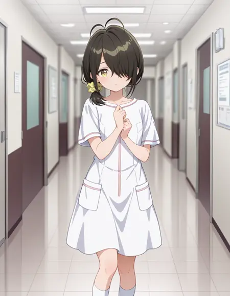 nurse outfit, white dress, short sleeves, white kneehighs