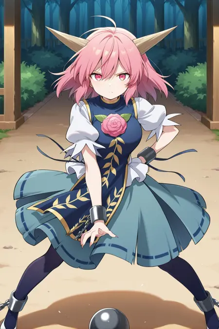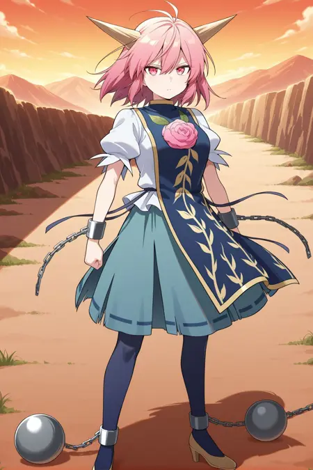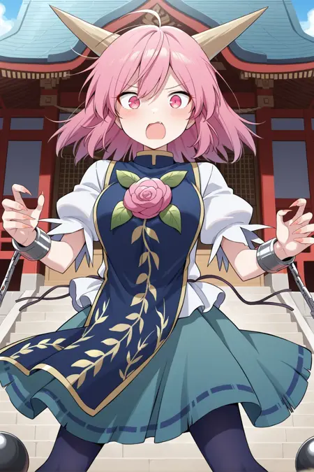 ibaraki douji's arm, 1girl, solo, pink eyes, pink hair, medium hair, horns, medium breasts,,