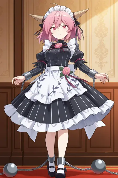 ibaraki douji's arm, 1girl, solo, pink eyes, pink hair, medium hair, horns, medium breasts,, ibaraki douji's arm \(why am i a maid?!\), alternate costume, maid headdress, horn ribbon, black ribbon, fishnet, vertical-striped dress, black dress, frilled dress, long sleeves, white apron, waist apron, back bow, white bow, black shoes, mary janes, cuffs, ball and chain restraint, long fingernails, sharp fingernails,
