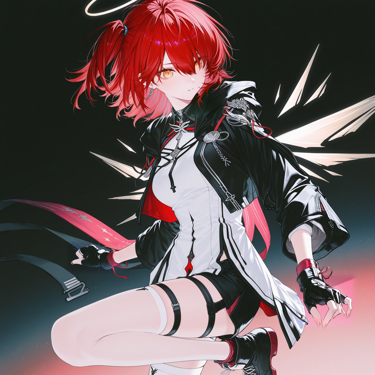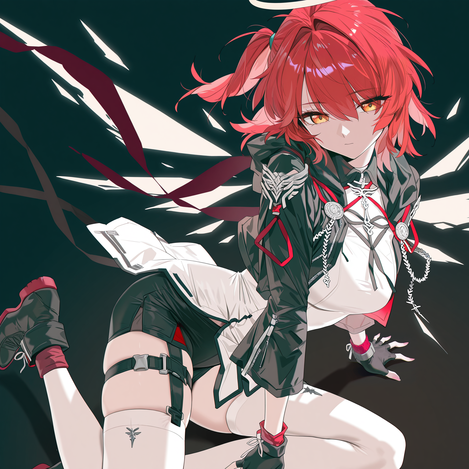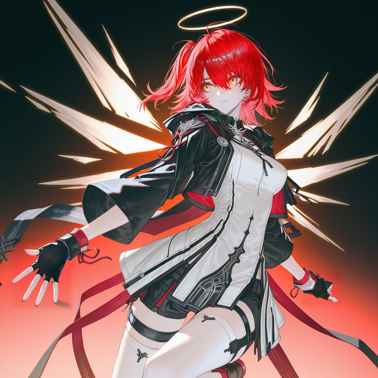服装:黑色夹克,短款夹克,长袖,白色连衣裙,无指手套,黑色手套,黑色短裤,白色过膝袜,多条大腿绑带,黑色长靴,踝靴,