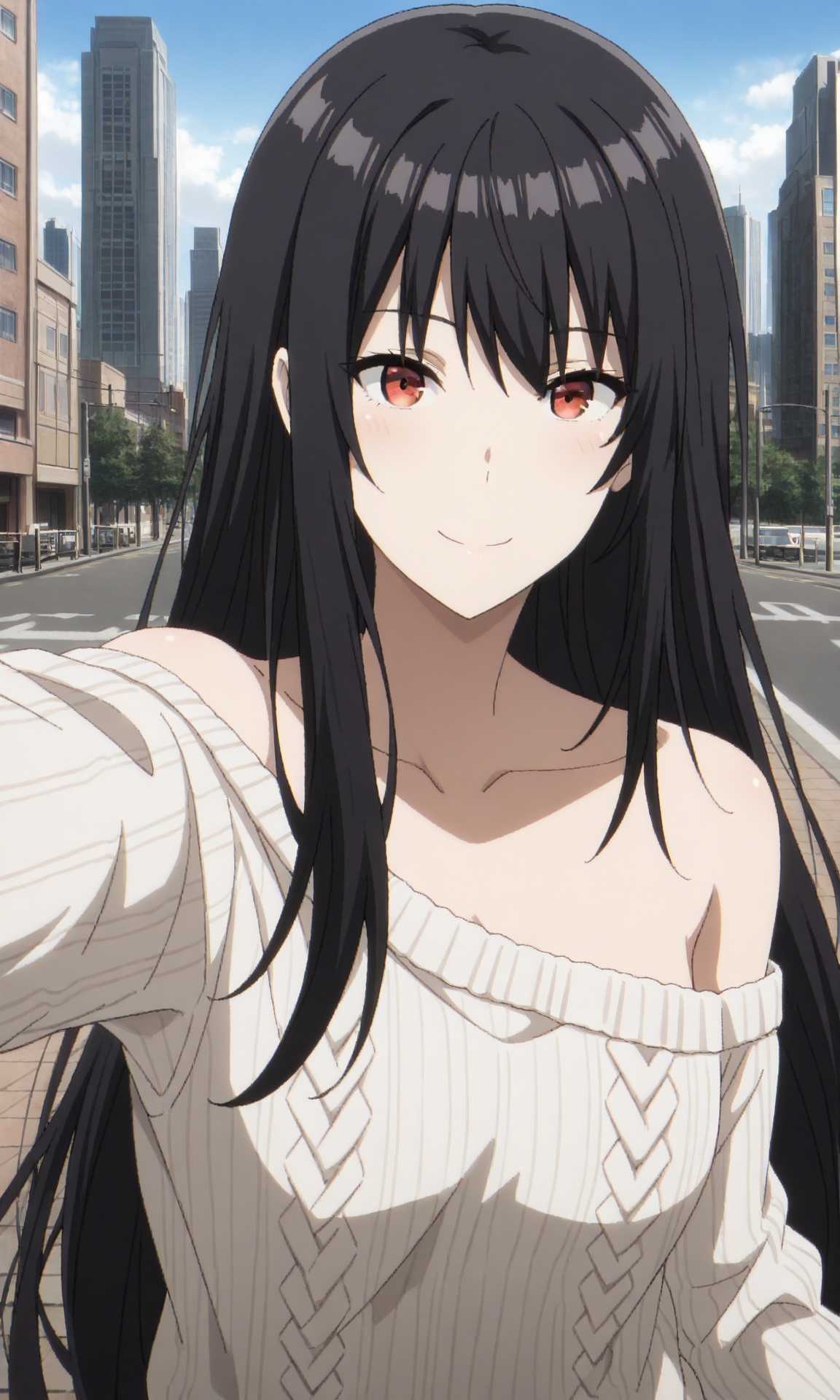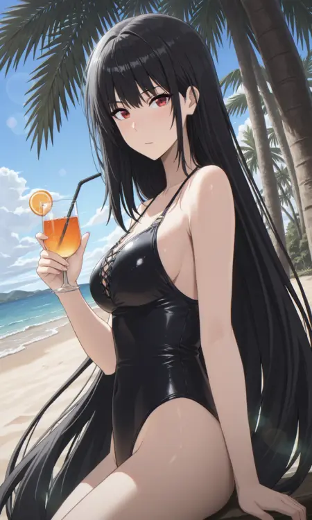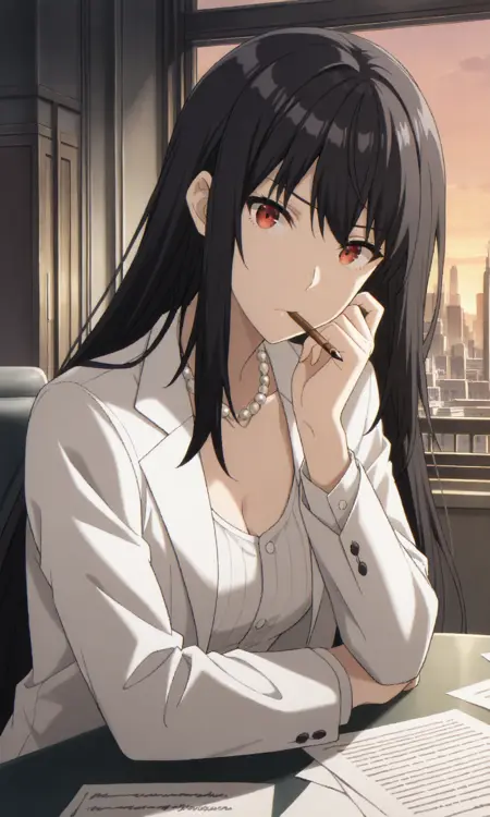 clairekagenoumv, 1girl, solo, red eyes, black hair, long hair,