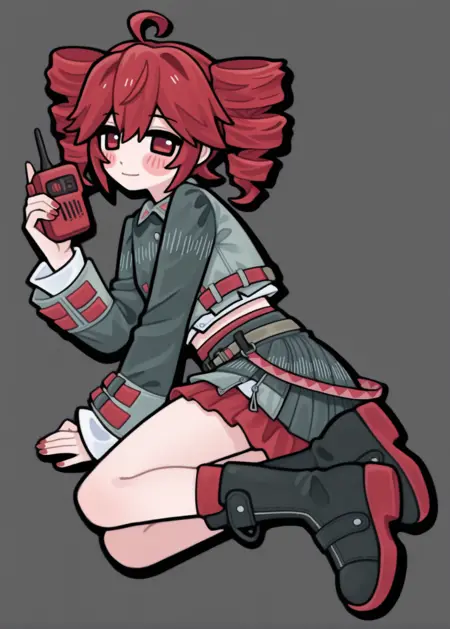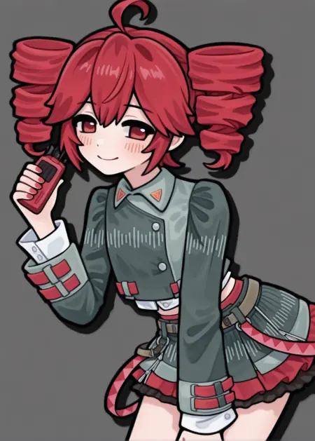赤い髪、ツインドリル、アホ毛、二股に分けられた前髪、赤い目、目の間の髪、頬の赤み、長袖、肩ベルト、ジャケット、シャツ、スカート、茶色のベルト、赤いベルト、ボタン、レイヤードスカート、赤いネイル、お腹の肌見せ、クロップトップ、スカート、ブーツ