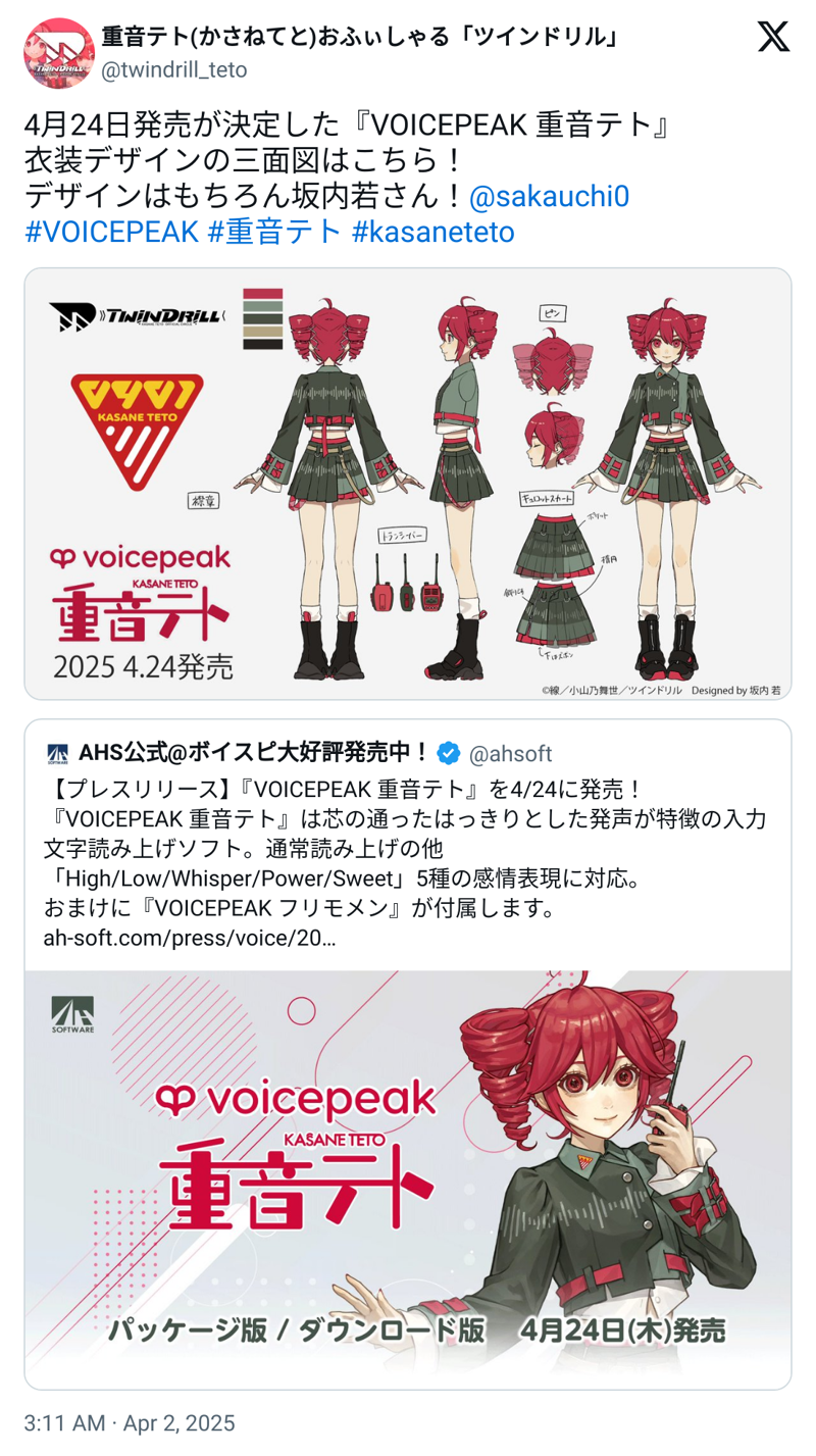 2025년 4월 1일, 카사네 테토의 17주년을 기念해 발표된 VOICEPEAK 음성 뱅크. 이번 업데이트의 디자인은 다시 한번 sakauchi waka가 그렸다.
