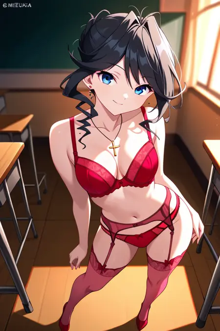 mitsuka,1girl,独身,乳房,蓝眼睛,黑发,过膝袜,蝴蝶结,肚脐,珠宝,中等乳房,内衣,内裤,耳环,项链,胸罩,仅穿内衣,十字架,女士内衣,吊袜带,红色过膝袜,红色内裤,红色胸罩,看向观众,乳沟,锁骨,十字架项链,粉色过膝袜,红色鞋履,全身,