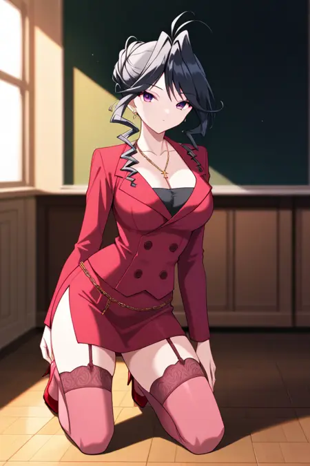 mitsuka,1girl,独身,长发,乳房,看向观众,衬衫,大乳房,裙子,黑发,长袖,过膝袜,乳沟,珠宝,夹克,紫眼睛,锁骨,全身,侧发,耳环,超短裙,项链,发髻,高跟鞋,绝对领域,纽扣,红裙子,吊袜带,钻头发型,正式,单发髻,西装,红色鞋履,红色夹克,蕾丝边,铅笔裙,双排扣,蕾丝边裤袜,粉色过膝袜,卷发,裙装套装,钻头侧发,蕾丝边过膝袜,天线发,大腿,黑色衬衫,链条,西装外套,天线发,侧开衩,红色过膝袜