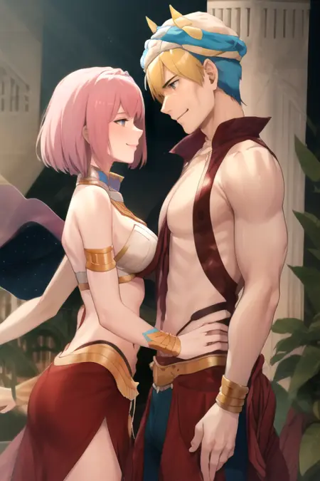 GilMashD, a man and (a woman, dancer), hetero, standing, smile, cowboy shot