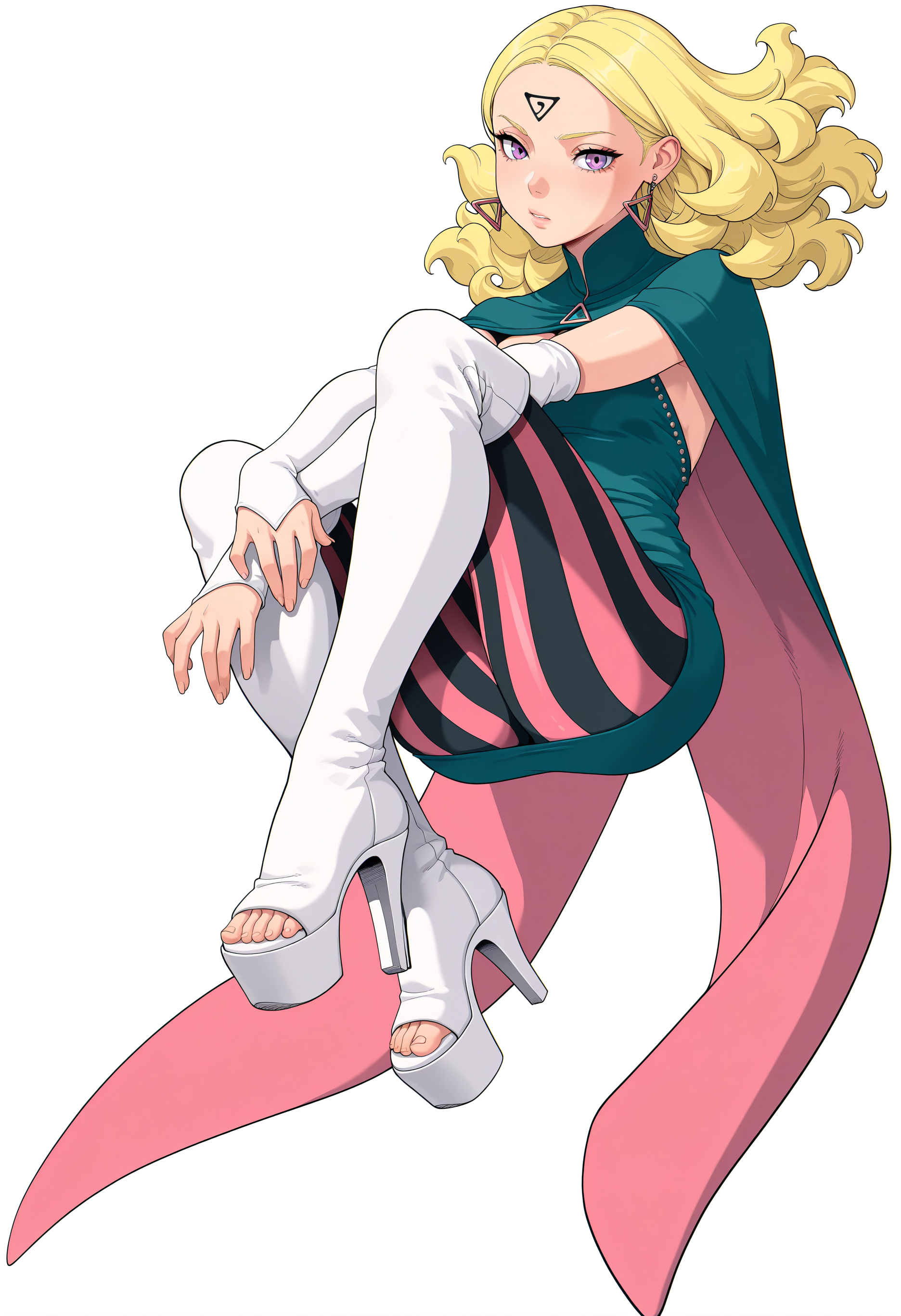 緑のドレス, 縦縞のレッグウェア, 縦縞, 白い靴, 太ももブーツ, 黒いキャップ