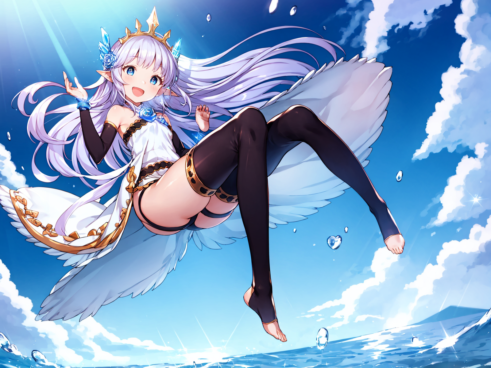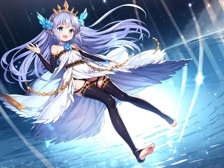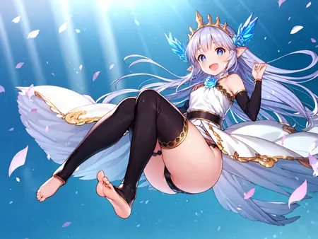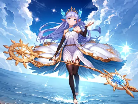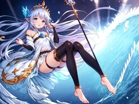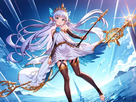 LiLyGrandBlue, very long hair, hair ornament, tiara, blue rose, white dress, toeless legwear, staff, bridal gauntlets,