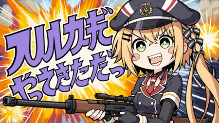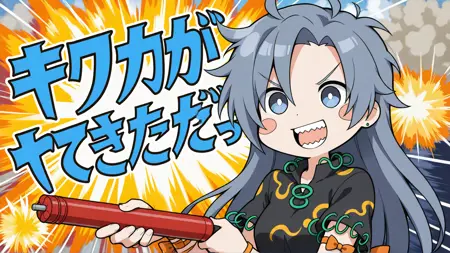 yatte kitazo, explosion, bright pupils, open mouth, sharp teeth, smile, blush stickers, holding, v-shaped eyebrows,