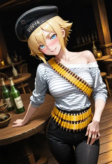 military uniform, black military hat, black military jacket, bandolier, ammunition belt, striped shirt, black pants,