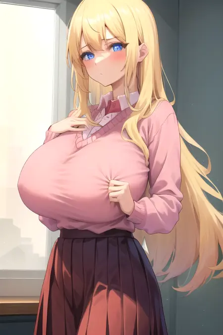 HoshigaokaYuri, 1girl, solo, long hair, blue eyes, pleated skirt, blonde hair, huge breasts, white shirt, long sleeves, sidelocks, collared shirt, pink sweater, red skirt, wing collar, pink shirt