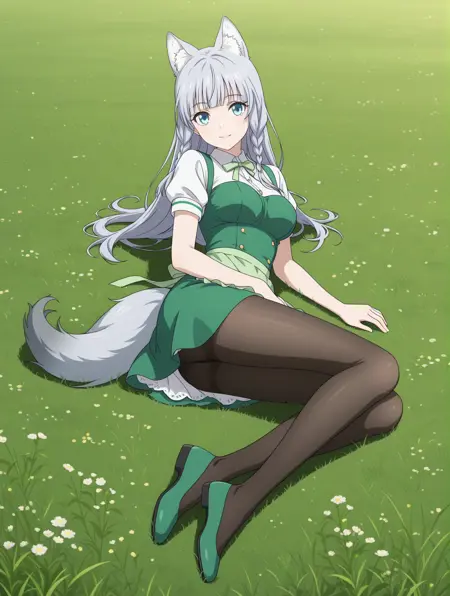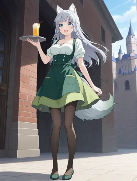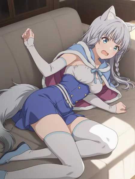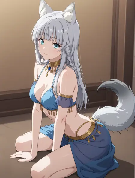 회색 머리카락, 파란 눈, 늑대 귀, 늑대 꼬리, 긴 머리