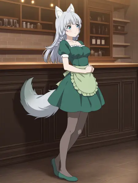 웨이트리스, 녹색 드레스, 앞치마, 스타킹, 녹색 평면 신발