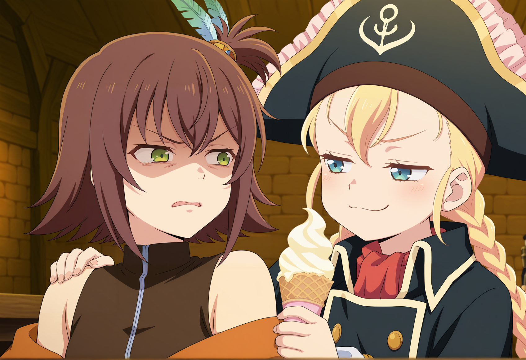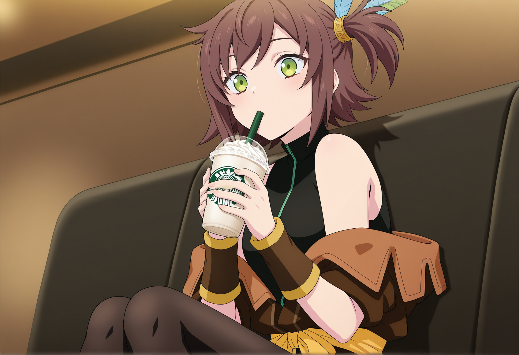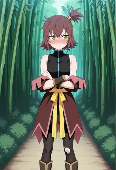 Notable tags: short hair, brown hair, side ponytail, feather hair ornament, green eyes, sleeveless, vest, off shoulder, sash, pantyhose, torn pantyhose, wristband, boots