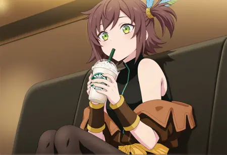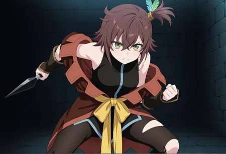 短い髪、茶色の髪、片側ポニーテール、羽の髪飾り、緑の目、ノースリーブ、ベスト、片肩出し、帯、タイツ、破れたタイツ、リストバンド、ブーツ