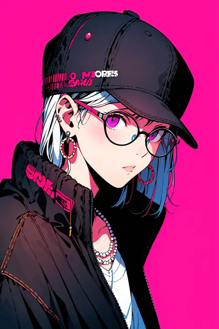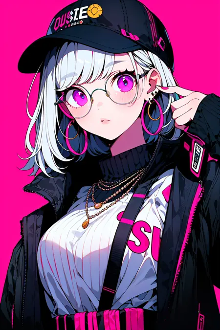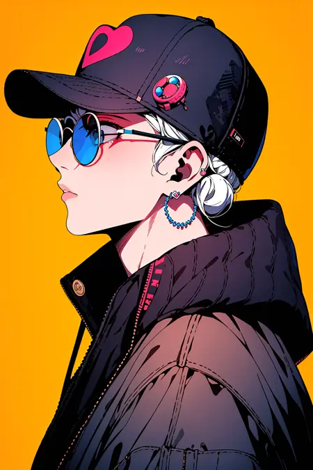 masterpiece, best quality, 1girl, saibo, cyberpunk, hat, earrings, simple background, pearls and jewels, yellow background, sunglasses,