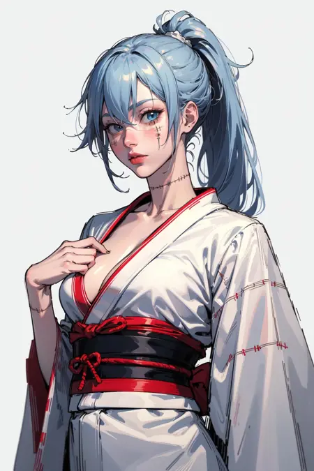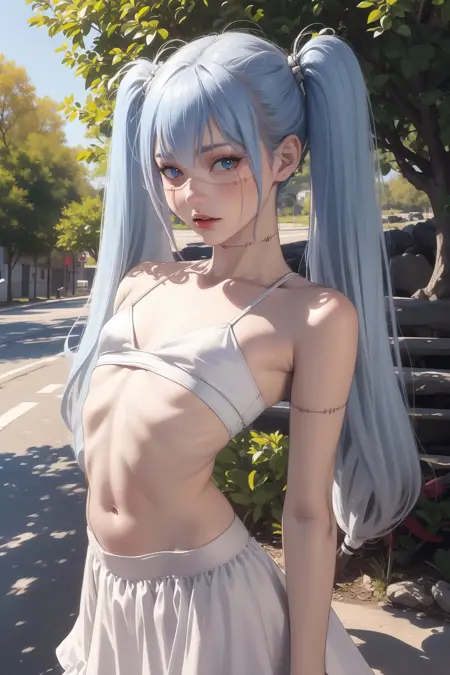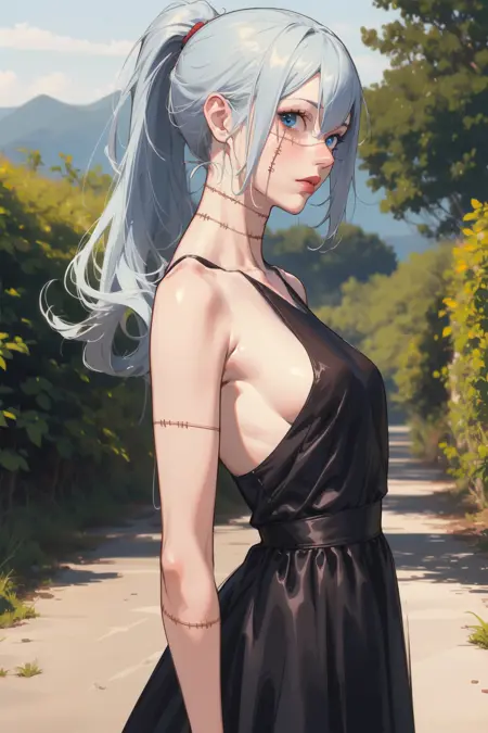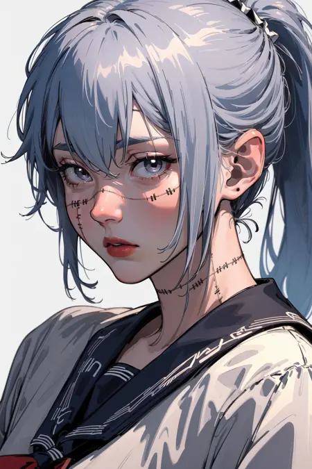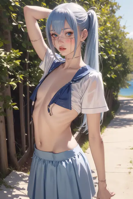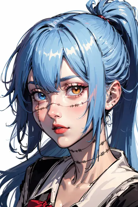 浅蓝色头发,长发,缝合线,缝合身体,虹膜异色,女学生制服