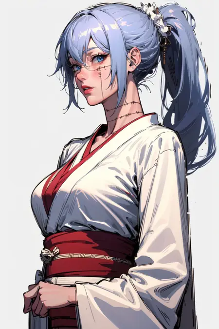 薄青い髪、長い髪、縫い目、縫い合わせられた体、虹彩異色症、学校制服