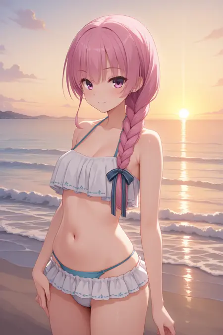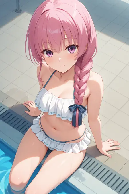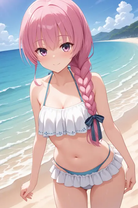 eeayase, 분홍 눈, 분홍 머리카락, 한 줄 땋은 머리, 땋은 페니테일, 어깨 위로 떨어진 머리, 파란색 머리 리본, 수영복, 흰색 비키니, 할터넥, 프릴이 있는 비키니, 층층이 된 비키니, 비키니 치마,