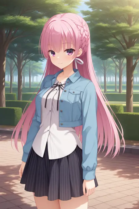 bbayase, ピンクの目, ピンクの髪, フレンチブレード, 白い髪リボン, 黒いネックリボン, 白いシャツ, チャラっと着たシャツ, 青いジャケット, クロップドジャケット, 開いたジャケット, 黒いスカート, プリーツスカート, 縦縞スカート, ピンストライプスカート,
