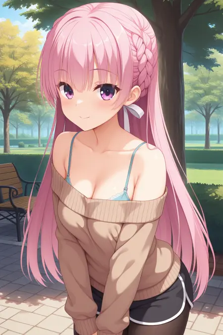 ddayase, ピンクの目, ピンクの髪, 低いツインブレード, 髪を肩にかけたスタイル, 小さな胸のルームウェア, 黒いキャミソール, ピンクのセーター, 多色セーター, 縦縞セーター, 開いたセーター, 袖が手首より長い, フードが下がっている, パジャマパンツ, 多色パンツ, 縦縞パンツ,