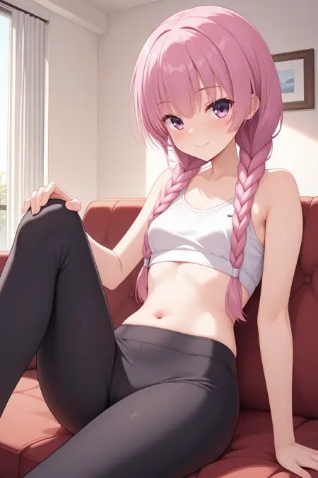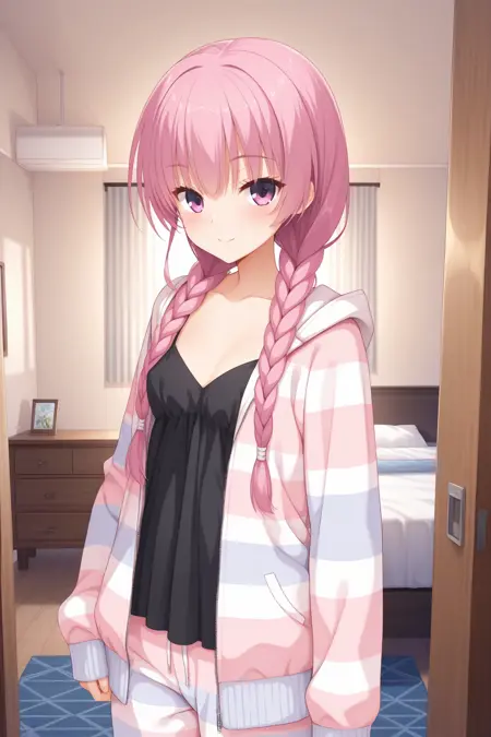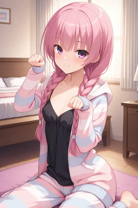 ddayase, 분홍 눈, 분홍 머리카락, 낮은 쌍 땋은 머리, 어깨 위로 떨어진 머리, 작고 가슴이 작은 루지웨어, 검은 캄리솔, 분홍 스웨터, 다색 스웨터, 줄무늬 스웨터, 열린 스웨터, 손목을 넘는 소매, 후드 내려진 상태, 파자마 바지, 다색 바지, 줄무늬 바지,