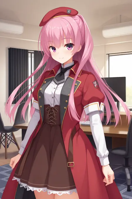 ccayase, 분홍 눈, 분홍 머리카락, 베레모, 검은 애스콧, 흰색 드레스 셔츠, 빨간 코트, 열린 코트, 긴 코트, 풍성한 짧은 소매, 긴 소매 위에 짧은 소매, 갈색 벨트, 갈색 치마, 십자 끈 치마, 허리 높은 치마, 프릴 치마,