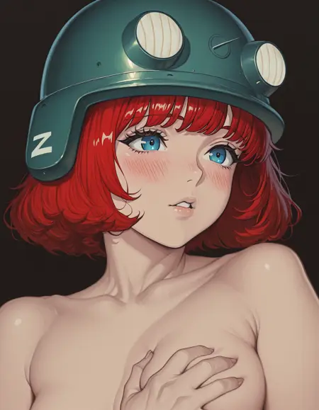 다음 트리거 사용: buhanka, 1girl, solo, green helmet, short hair, red hair, bangs, blue eyes, green turtleneck,