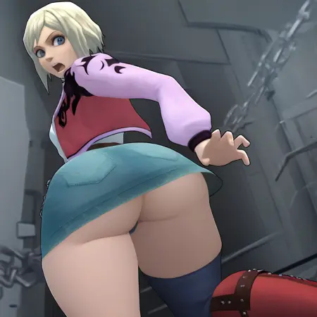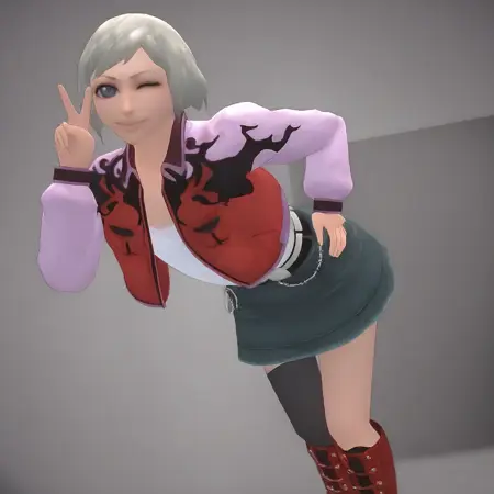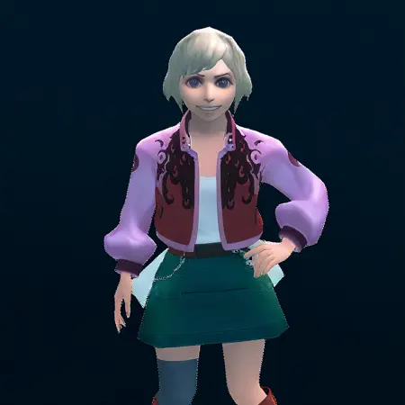 bleach blonde hair, short hair, blue eyes, pink and red jacket, white shirt, belt, denim skirt, single stocking, red knee-high boots,