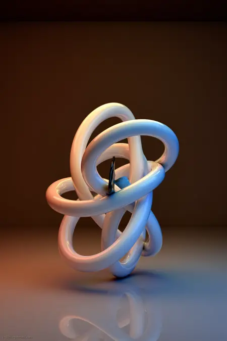 “서로 얽힌 유리 링의 Cinema 4D 추상 조각, 색색의 가장자리 조명, 그라데이션 배경 위에 떠 있는 형태.”