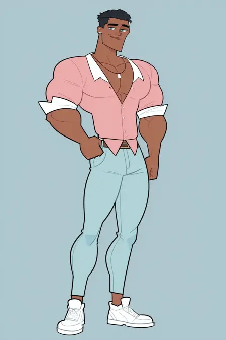CalebTDI23, 1boy, dark skinned male, pink button-up shirt, light blue pants, white sneakers, necklace with white pendant, short black hair, light blue earrings, lips, big lips, gray-green eyes, caleb (tdi),