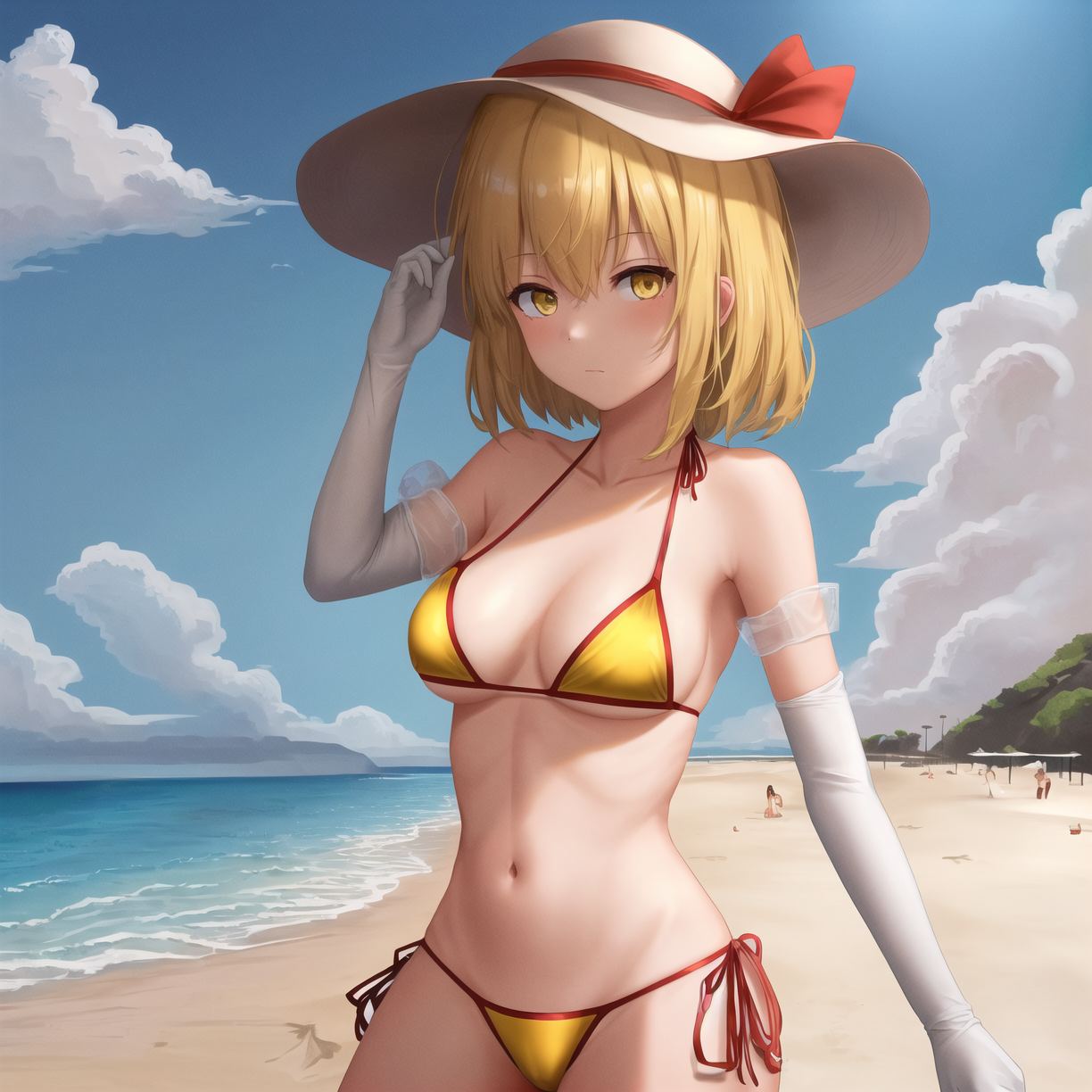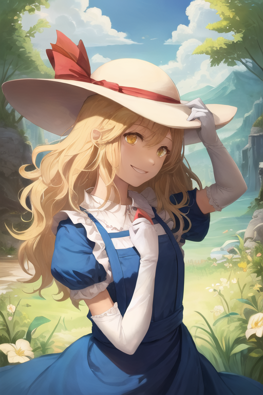 示例提示词: lora:KanaAnaberal_v2-10:1, Kana Anaberal, 帽子, 1girl, 单人, 户外, 黄色眼睛, 微笑, (波浪发), (短发), 围裙