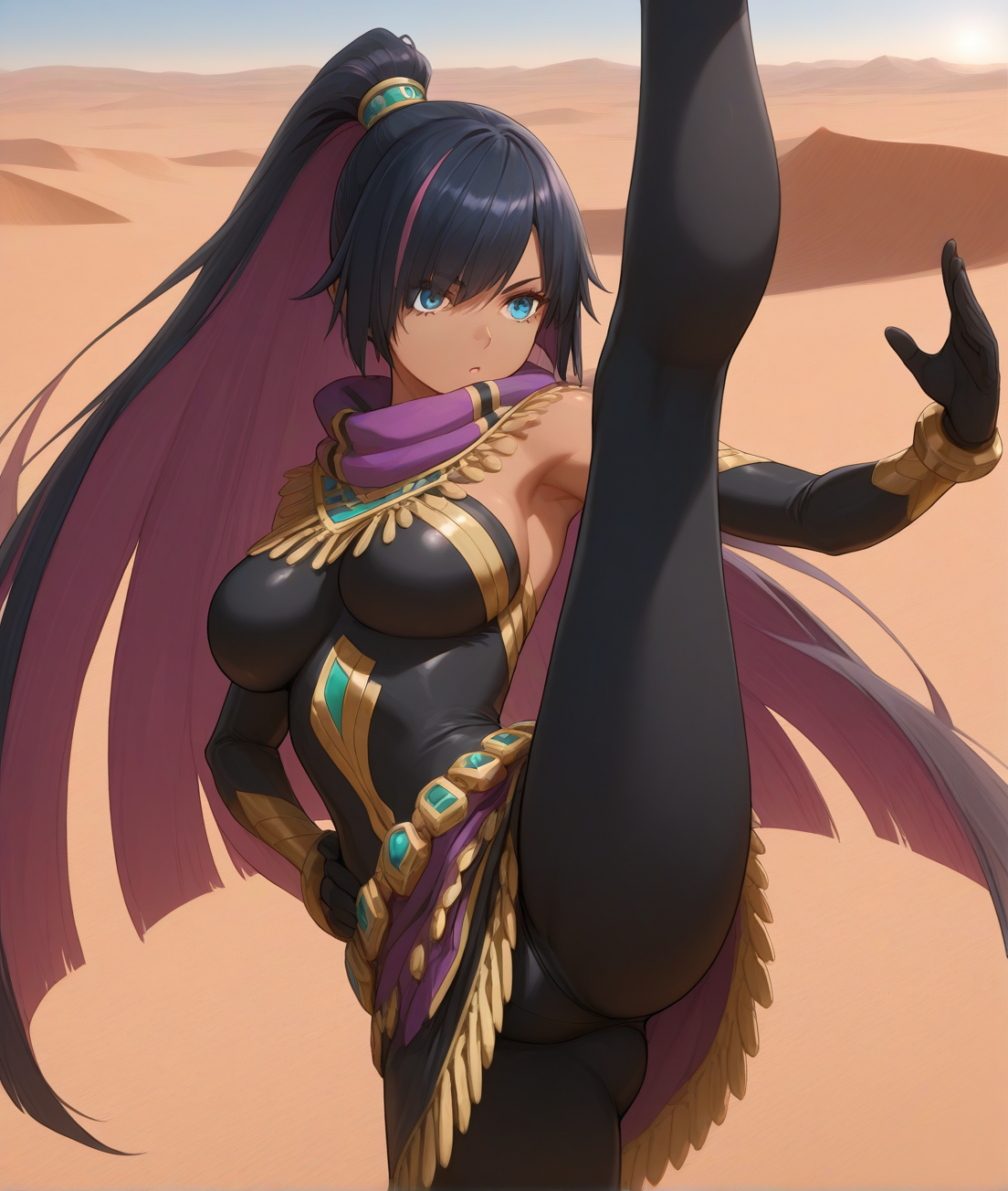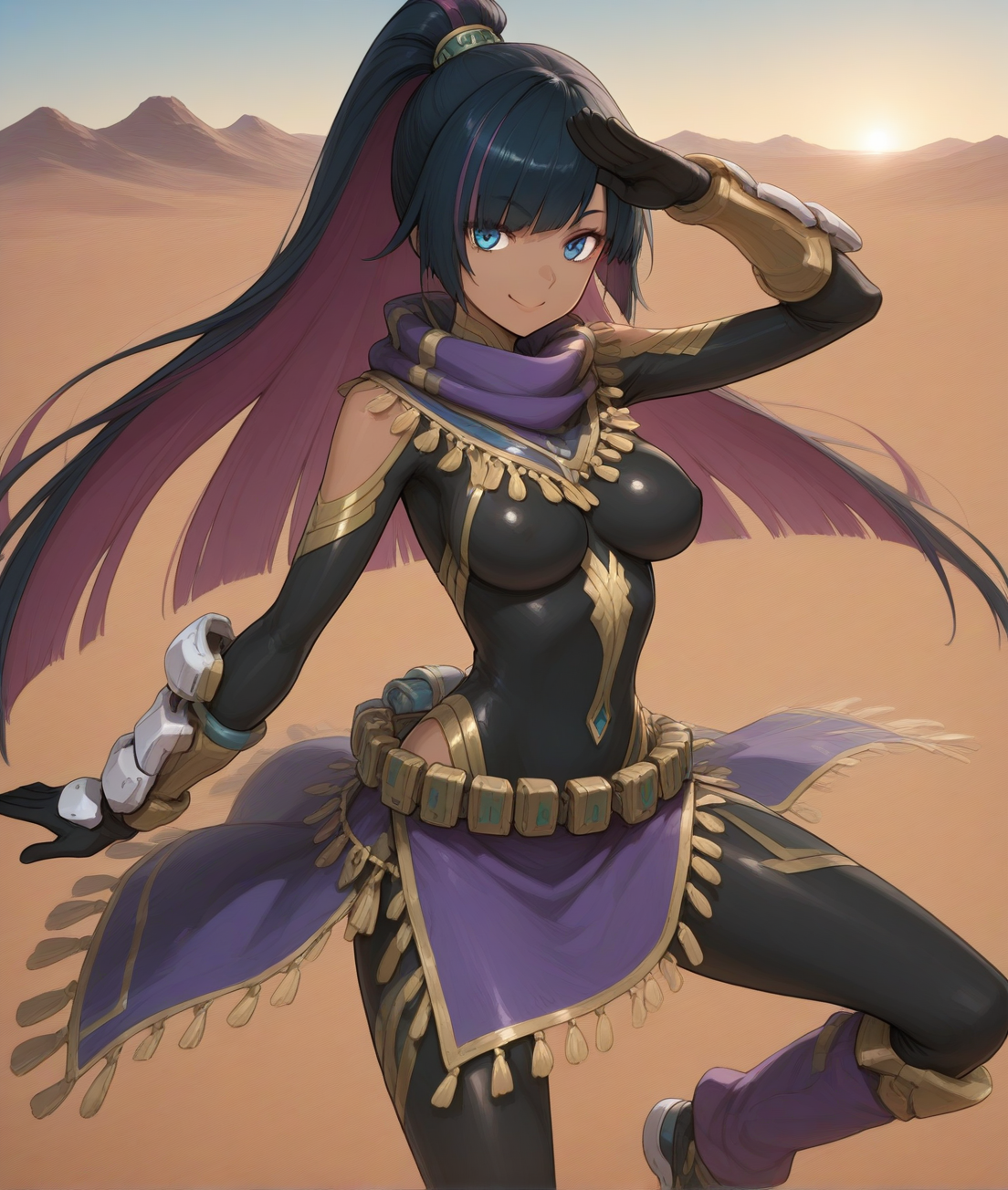 nadereh, make up, black bodysuit, mecha gauntlet, knee armors, leg_warmers, shoes,
