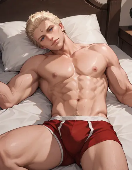 ffxiv_nero, 1boy, tall male, blue eyes, blonde hair, forehead mark, stubble