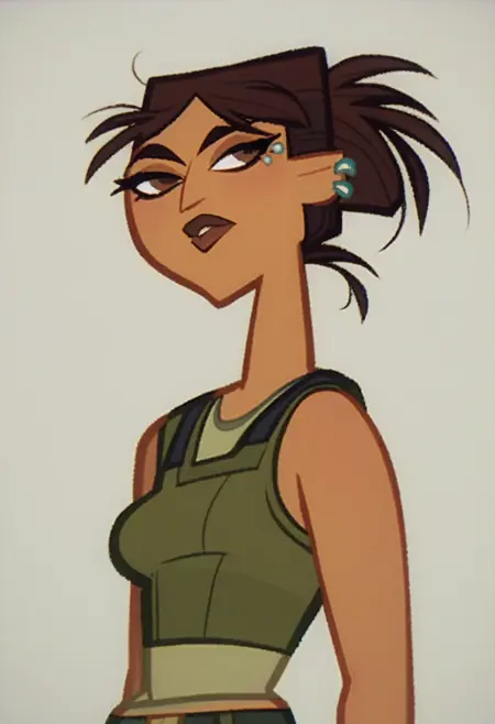 AxelTDI23, 1girl, long brown hair tied back, black and beige-green sleeveless top, green cargo pants, black boots, tan skin, earrings, piercing, brown eyes, dark brown lips, big lips