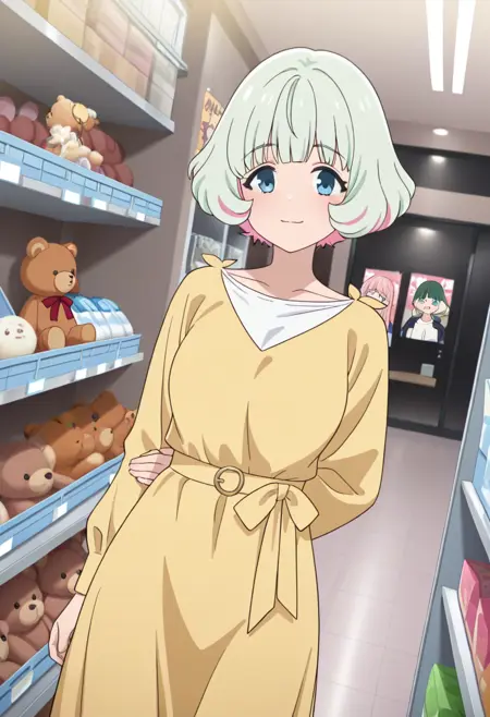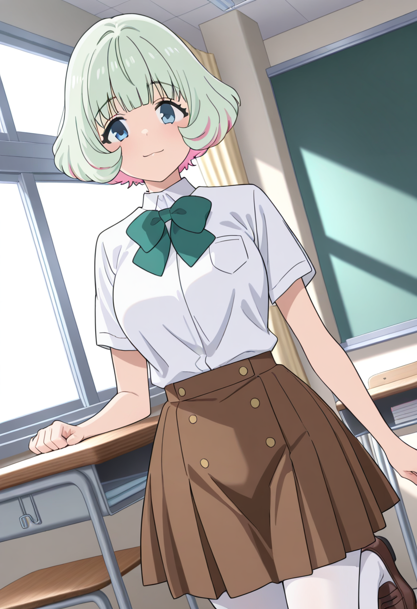 hibiki_morishima,1girl,solo,green hair,short hair,colored inner hair,pink hair,blue eyes,bangs,school uniform,yellow jacket,long sleeves,bowtie,green bow,brown skirt,pleated skirt,white pantyhose,shoes,brown footwear,loafers,
