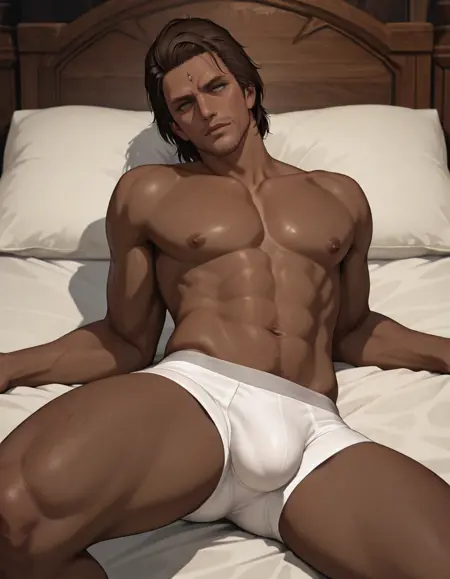 gaius_ffxiv, 1boy, mature male, dark skin, brown hair, medium hair, gray-green eyes, forehead mark, stubble