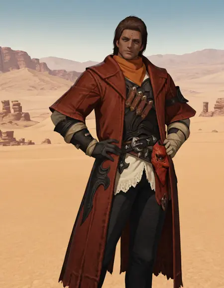 orange bandana, red long coat, armguards, gloves, leather vest, white shirt, belt, masks, black pants, black shoes