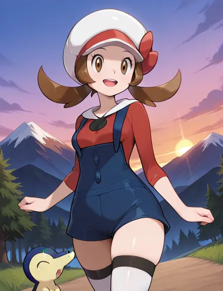 棕色眼睛,棕色头发,双马尾,睫毛,出租车帽,帽结,白色过膝袜,背带裤,红衬衫,红色蝴蝶结