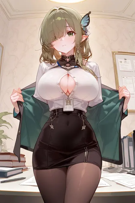 트리거 단어:De Zeven Provincien (azur lane),,pointy ears,green eyes,hair over one eye,large breasts,green hair,butterfly hair ornament