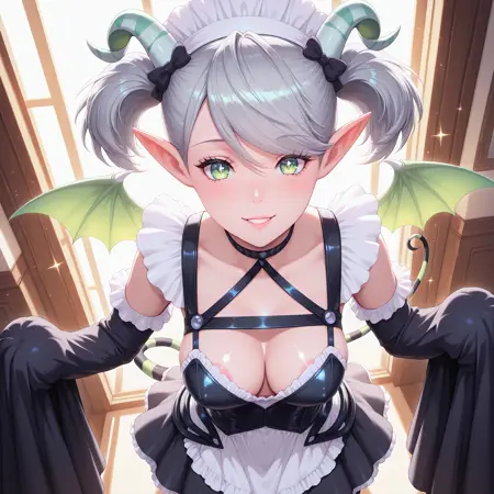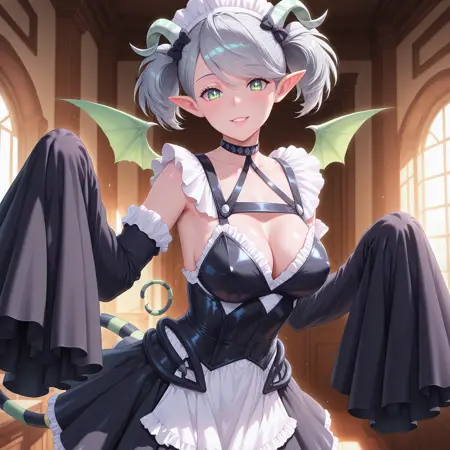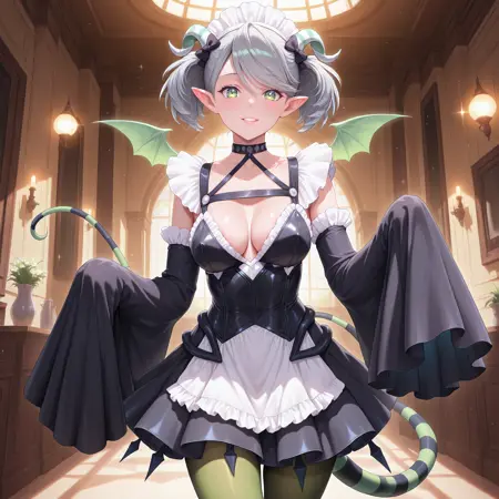 迷宮、角、翼、とがった耳、タイツ、悪魔の翼、悪魔の角、灰色の目、デュエルモンスター、ドレス、悪魔の少女、白髪、ツインテール、白いタイツ、低めの翼、イヤリング、ジュエリー、白い手袋、複数の翼、白いドレス、白い角、外付けのカラー、骨盤カーテン、裸の肩、太もも、透明な翼、アーマー、外付けの袖、コート、ストラップレス、サスペンダー