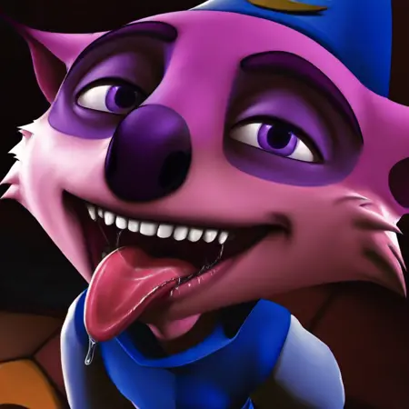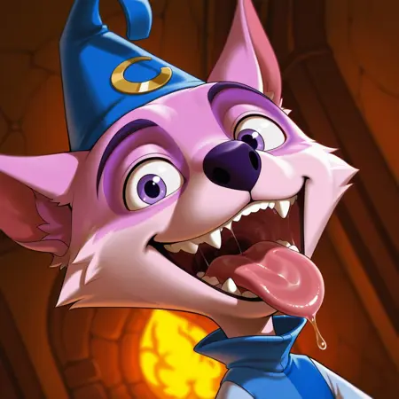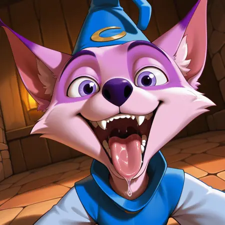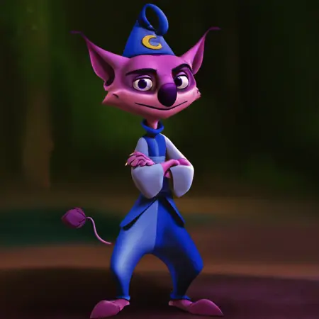 cat, cat boy, purple fur, purple eyes, black nose, lion tail, claws, wizard hat, blue shirt, blue pants,