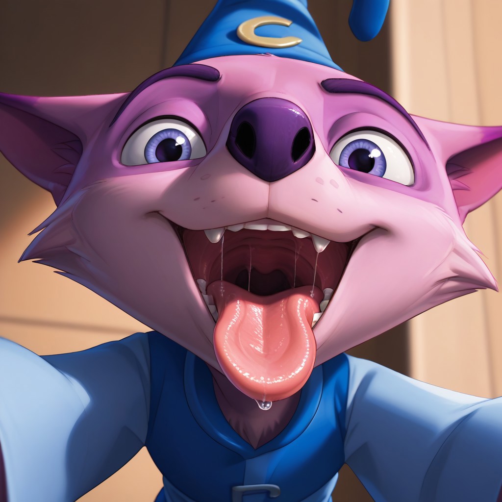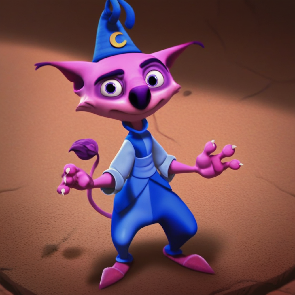 cat boy, purple fur, purple eyes, black nose, lion tail, claws, wizard hat, blue shirt, blue pants,