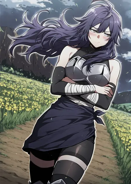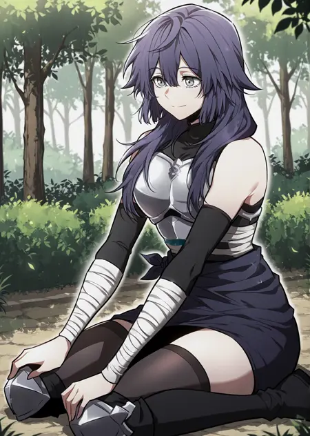 Lensa, purple hair, dark ninja outfit, long purple hair, messy hair, layered hair, side bangs, gray eyes